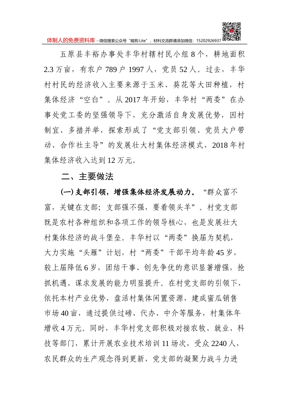 体制人的免费资料库 --微信搜索公众号“暗狗 Lite”,材料交流群请添加微信:15202926937丰裕办事处丰华村发展壮大村级集体经济案例汇编一、资源盘活型对闲置、低效使用的办公用房、会堂、老校舍、厂房、仓库等...