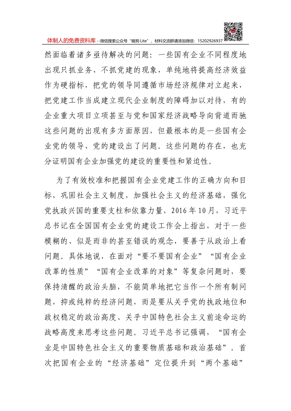 体制人的免费资料库 --微信搜索公众号“暗狗 Lite”,材料交流群请添加微信:15202926937国企党建专题党课讲稿:关于加强国有企业党的建设重要论述党的十八大以来,在总结、继承党多年来在国有企业建设方面的实...