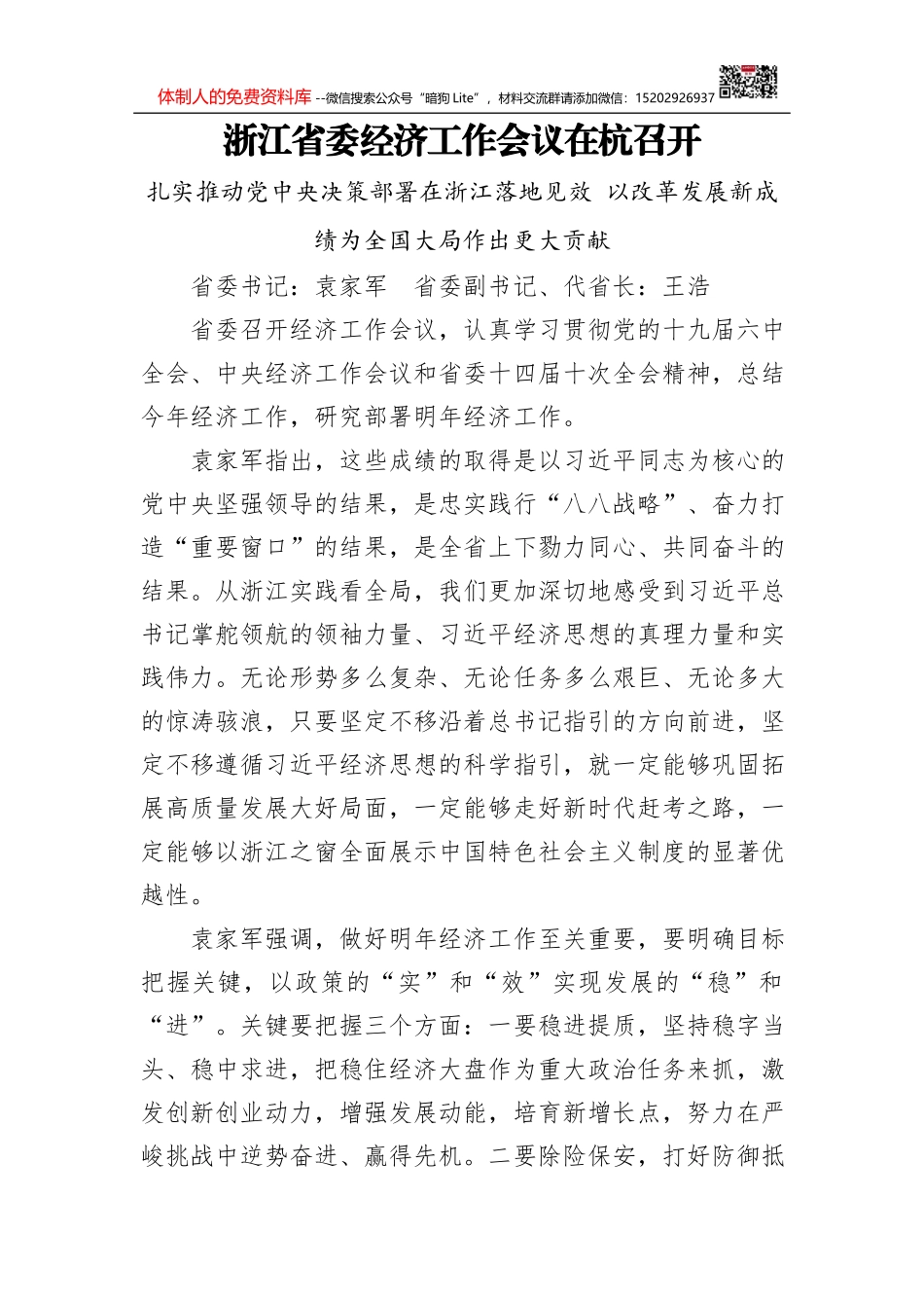 体制人的免费资料库 --微信搜索公众号“暗狗 Lite”,材料交流群请添加微信:15202926937浙江省委经济工作会议在杭召开扎实推动党中央决策部署在浙江落地见效 以改革发展新成绩为全国大局作出更大贡献省委书记...