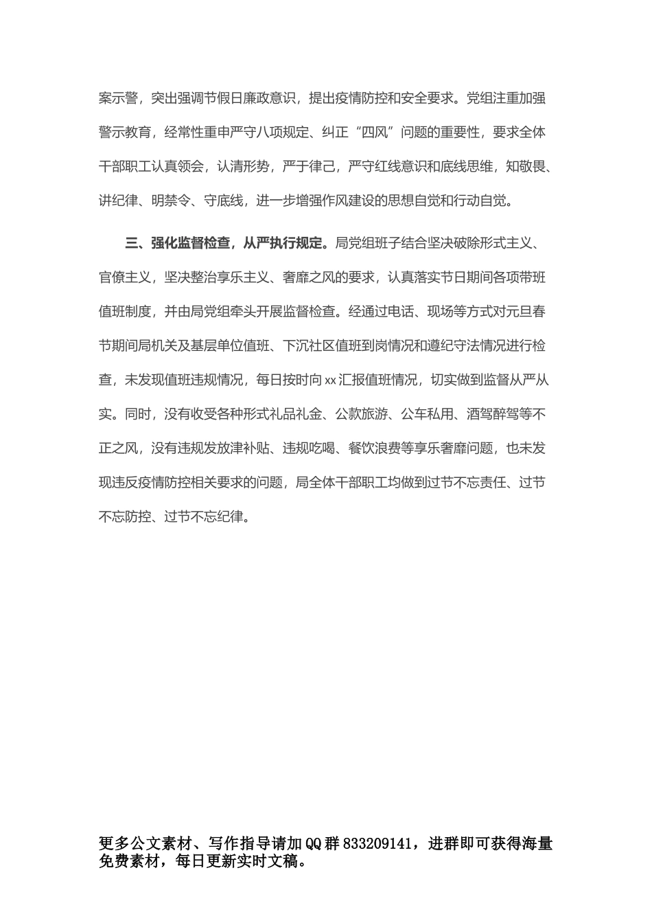 1更多公文素材、写作指导请加 QQ 群 833209141,进群即可获得海量免费素材,每日更新实时文稿。xx 局严格落实区纪委相关规定,深入贯彻落实全面从严治党要求,积极响应纠治“四风”号召,切实改进工作作风,...