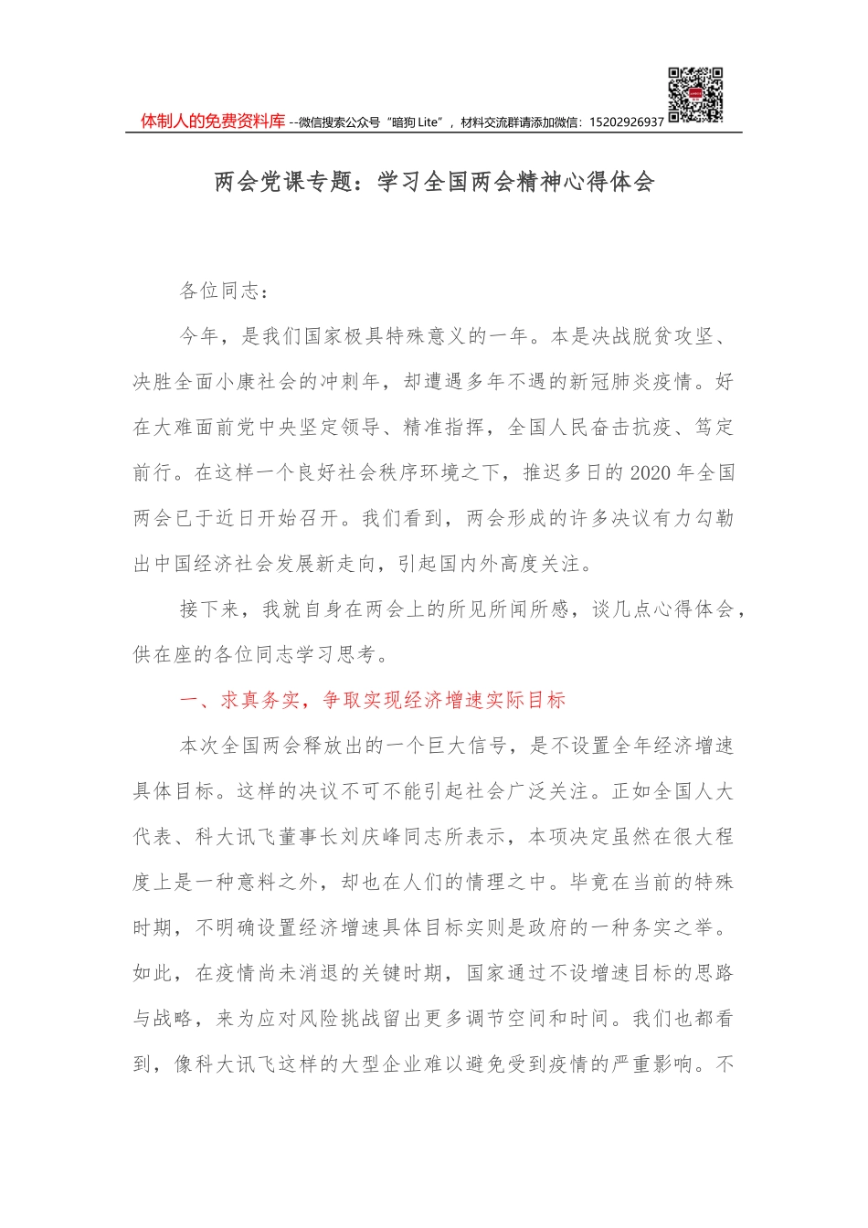 体制人的免费资料库 --微信搜索公众号“暗狗 Lite”,材料交流群请添加微信:15202926937两会党课专题:学习全国两会精神心得体会 各位同志:今年,是我们国家极具特殊意义的一年。本是决战脱贫攻坚、决胜全面...