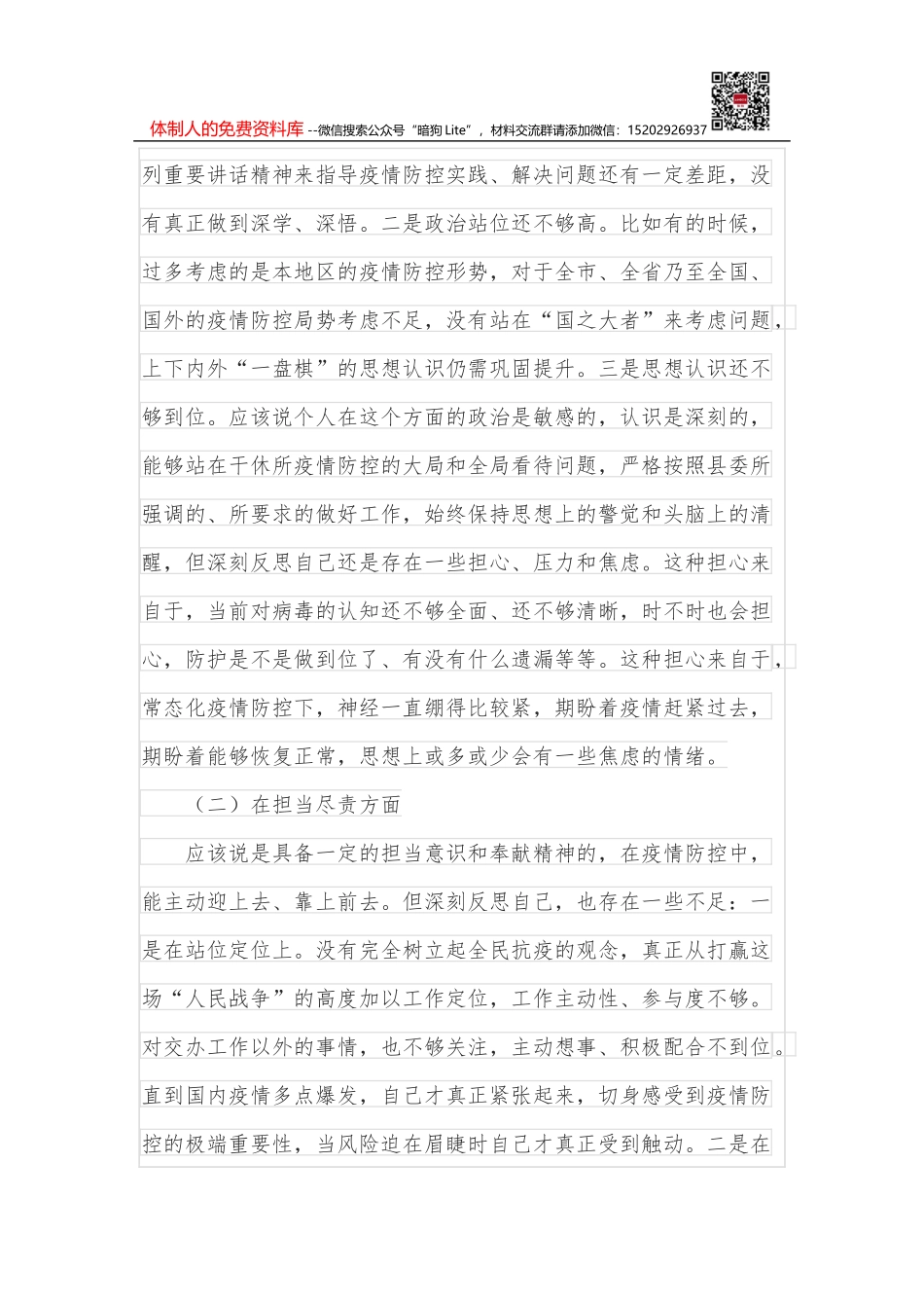 体制人的免费资料库 --微信搜索公众号“暗狗 Lite”,材料交流群请添加微信:15202926937委疫情防控专题民主生活会个人对照检查材料按照“关于开好加强和改进疫情防控工作专题民主生活会”通知要求,本人紧扣会...