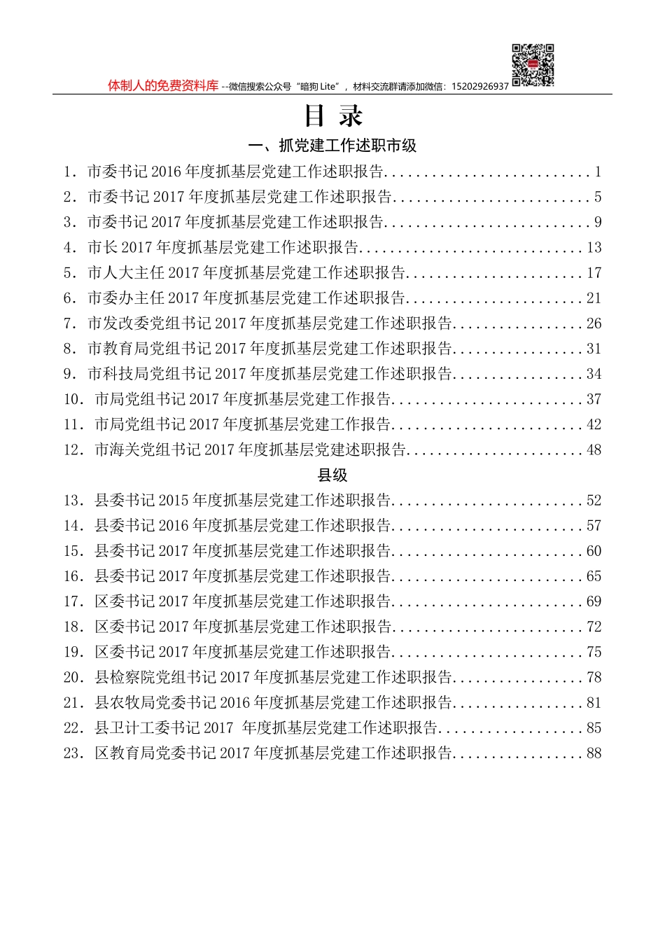 体制人的免费资料库 --微信搜索公众号“暗狗 Lite”,材料交流群请添加微信:15202926937党 建 述 职 材 料 汇 编(75 篇 31 万字)体制人的免费资料库 --微信搜索公众号“暗狗 Lite”,材料交流群...