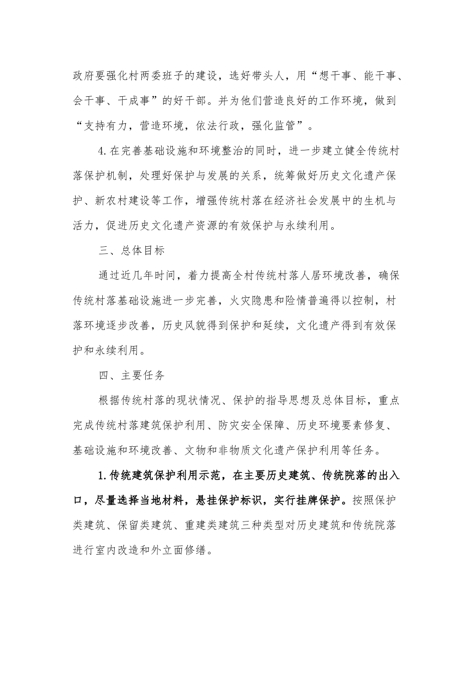 XX 村传统村落保护实施方案按照国家、省、市、县加强传统村落保护的要求,为加快传统村落保护和发展,进一步保护历史文化遗产,改善农村人居环境,浪街村特制定以下实施方案:一、指导思想认真贯彻落实党的 XXX...