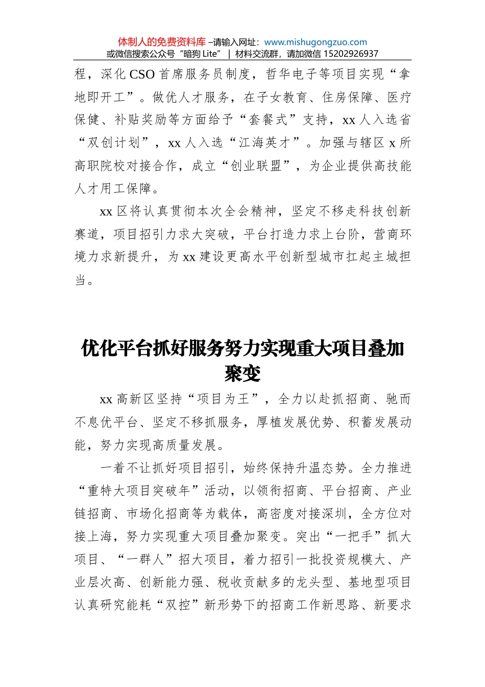 体制人的免费资料库 –请输入网址:www.mishugongzuo.com或微信搜索公众号“暗狗 Lite” | 材料交流群,请加微信 15202926937在全市项目建设交流会上的发言汇编(3篇)目录1.聚力科创聚焦项目高水平打造创新...