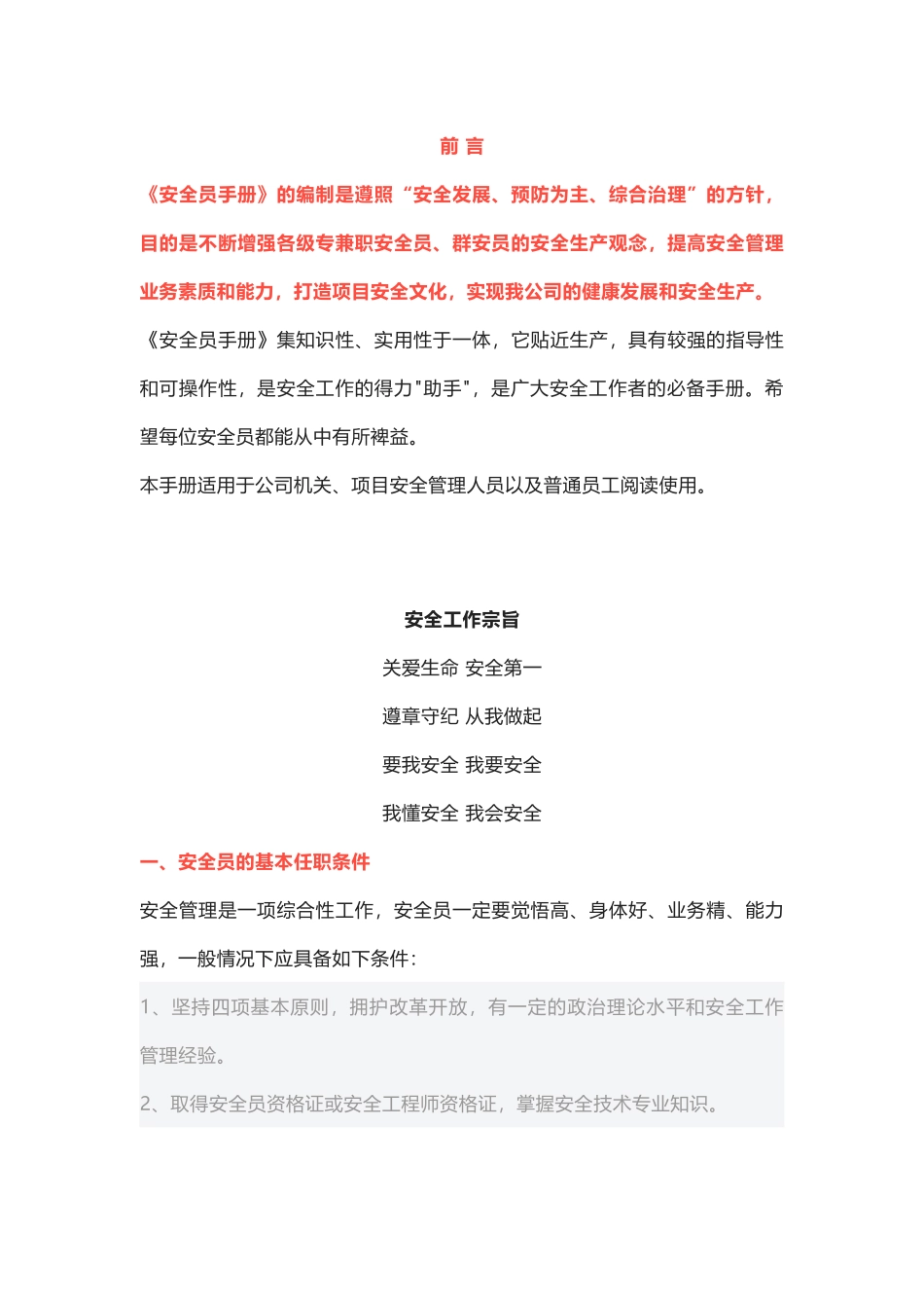 前 言《安全员手册》的编制是遵照“安全发展、预防为主、综合治理”的方针,目的是不断增强各级专兼职安全员、群安员的安全生产观念,提高安全管理业务素质和能力,打造项目安全文化,实现我公司的健康发展和安...