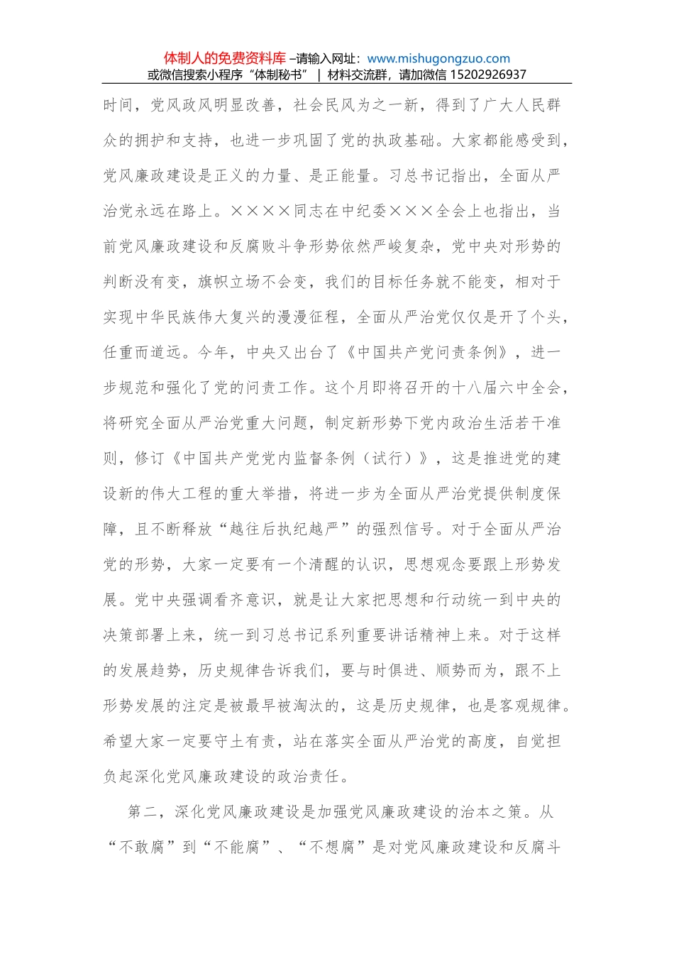 体制人的免费资料库 –请输入网址:www.mishugongzuo.com或微信搜索小程序“体制秘书” | 材料交流群,请加微信 15202926937在党风廉政建设工作会上的讲话同志们:刚才,××个单位和部门作了很好的经验介绍...