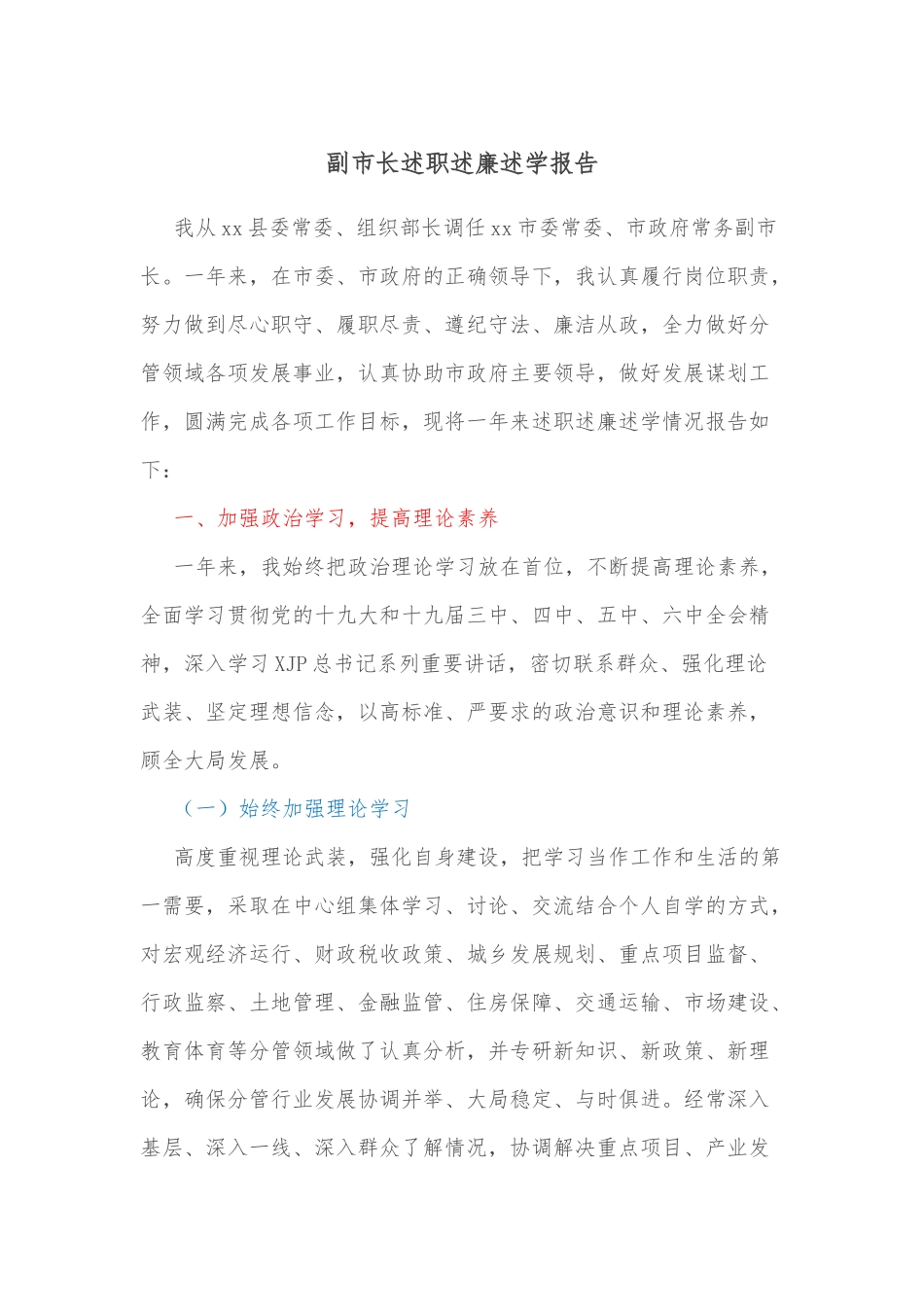 副市长述职述廉述学报告我从 xx 县委常委、组织部长调任 xx 市委常委、市政府常务副市长。一年来,在市委、市政府的正确领导下,我认真履行岗位职责,努力做到尽心职守、履职尽责、遵纪守法、廉洁从政,全力...