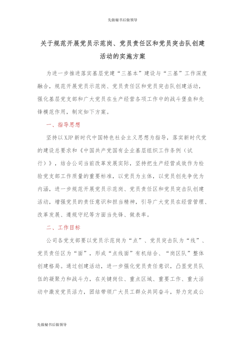 先做秘书后做领导先做秘书后做领导关于规范开展党员示范岗、党员责任区和党员突击队创建活动的实施方案为进一步推进落实基层党建“三基本”建设与“三基”工作深度融合,规范开展党员示范岗、党员责任区和党员突...