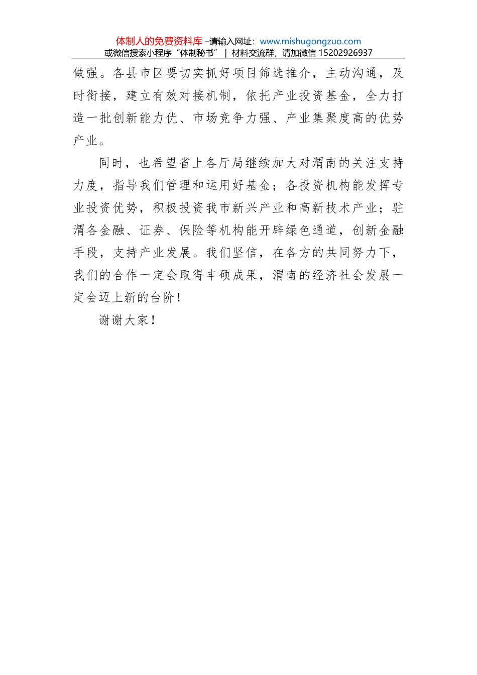 体制人的免费资料库 –请输入网址:www.mishugongzuo.com或微信搜索小程序“体制秘书” | 材料交流群,请加微信 15202926937在渭南市政府投资基金揭牌暨合作项目签约仪式上的讲话李明远各位领导,各位来宾,...