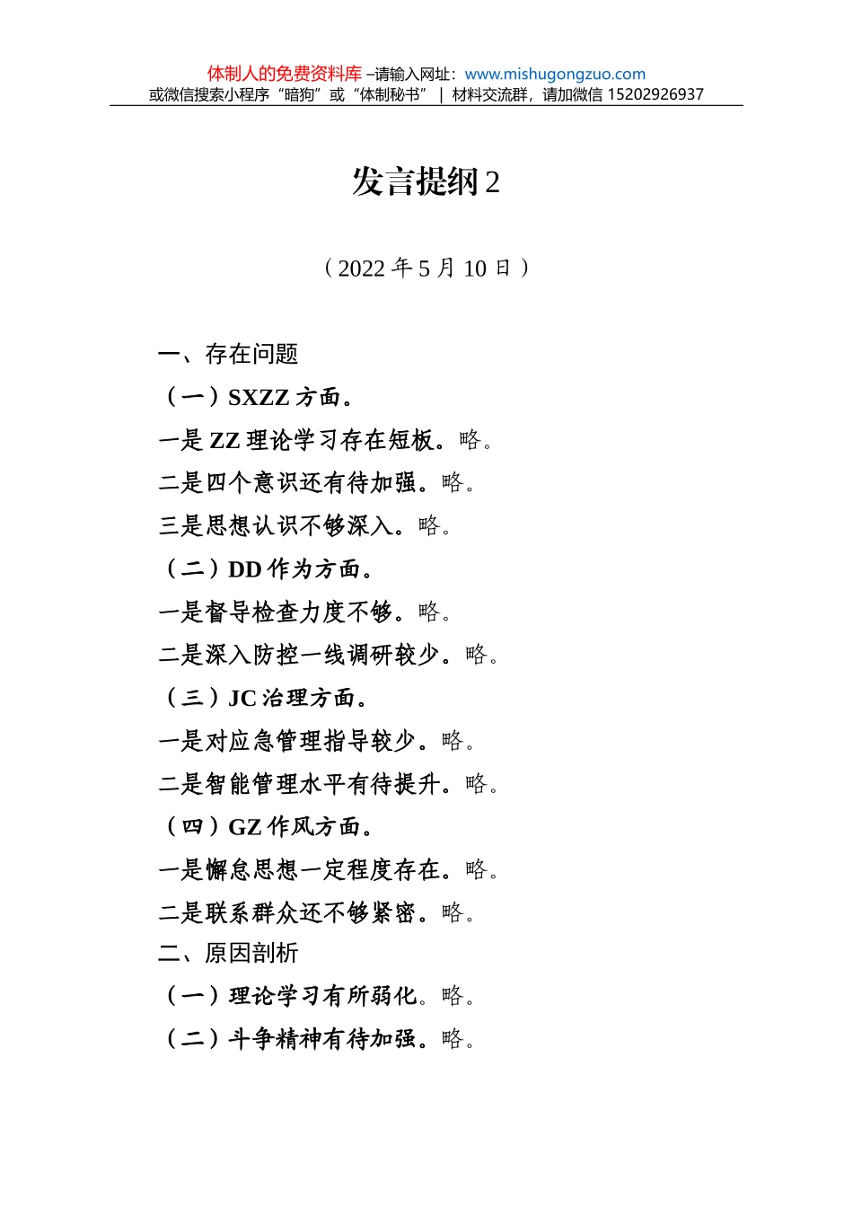 体制人的免费资料库 –请输入网址:www.mishugongzuo.com或微信搜索小程序“暗狗”或“体制秘书” | 材料交流群,请加微信 15202926937发言提纲 1(2022 年 5 月 10 日)一、存在问题(一)SXZZ 方面...