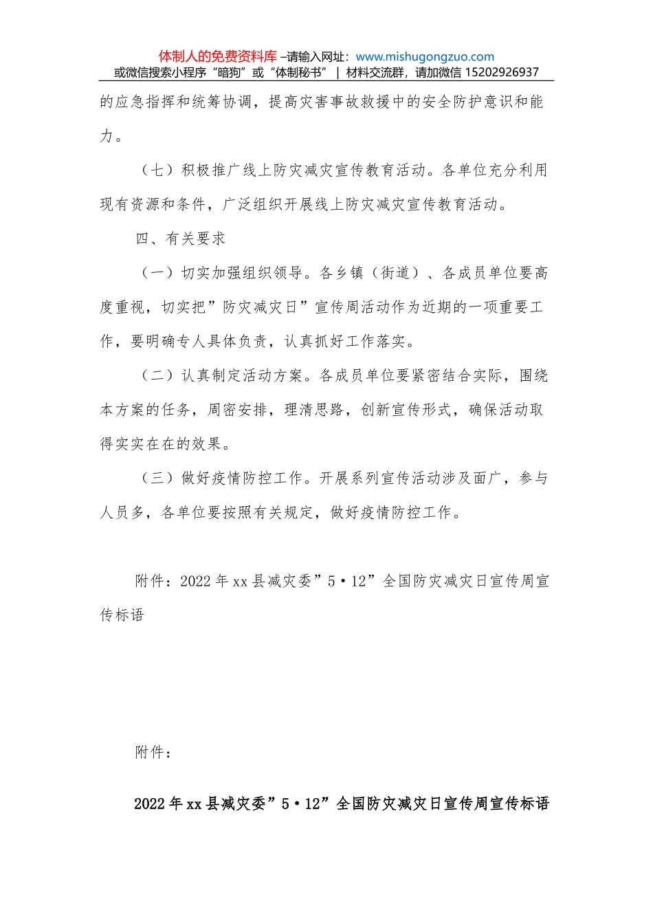 体制人的免费资料库 –请输入网址:www.mishugongzuo.com或微信搜索小程序“暗狗”或“体制秘书” | 材料交流群,请加微信 15202926937xx 县 2022 年全国”防灾减灾日”宣传周活动方案为深入贯彻落实 XJP...