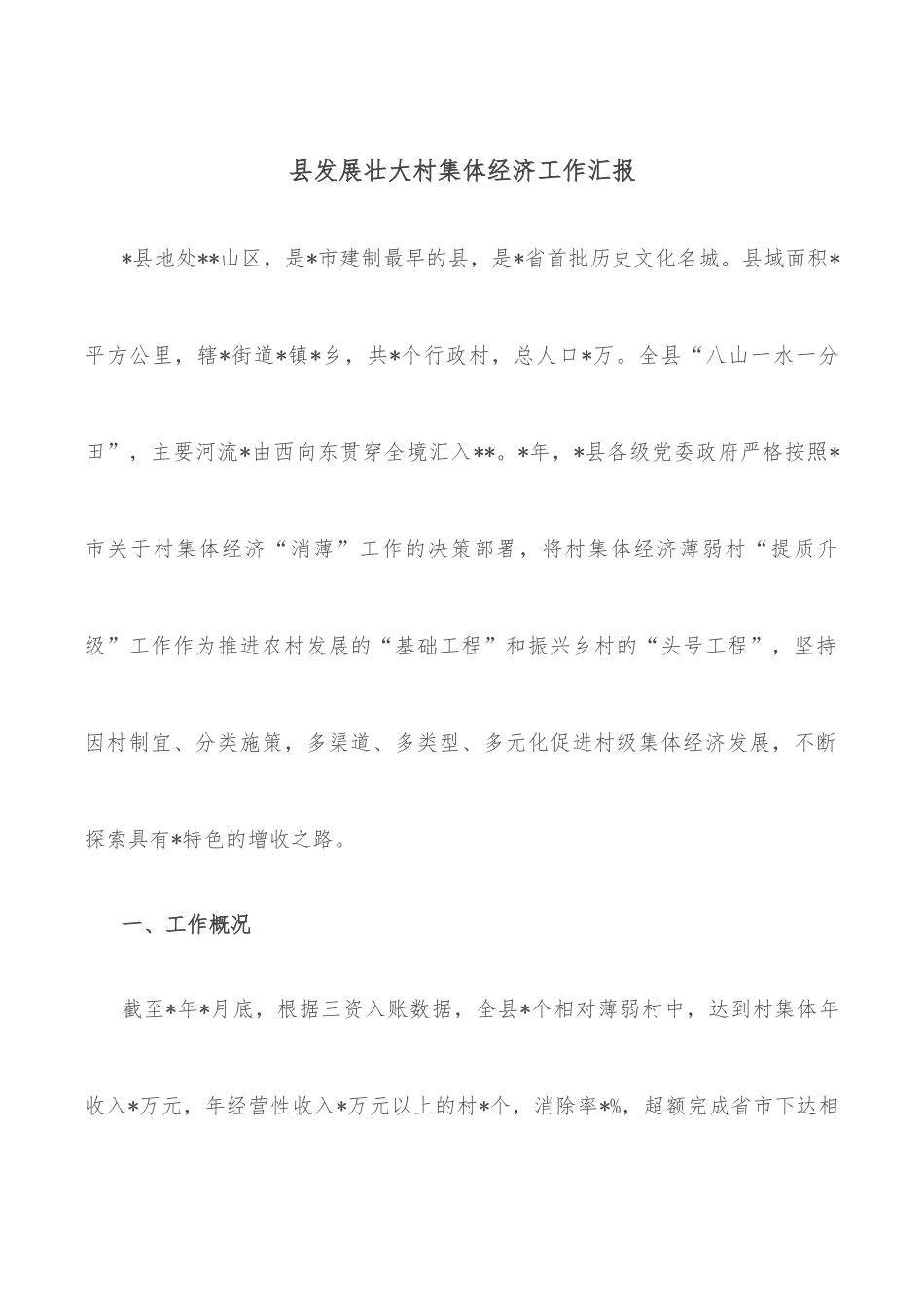县发展壮大村集体经济工作汇报*县地处**山区,是*市建制最早的县,是*省首批历史文化名城。县域面积*平方公里,辖*街道*镇*乡,共*个行政村,总人口*万。全县“八山一水一分田”,主要河流*由西向东贯穿全境汇入*...