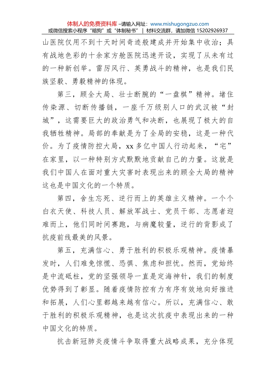 体制人的免费资料库 –请输入网址:www.mishugongzuo.com或微信搜索小程序“暗狗”或“体制秘书” | 材料交流群,请加微信 15202926937疫情党课讲稿:在疫情背景下的中国文化自信一、在抗击疫情中坚定中国文...