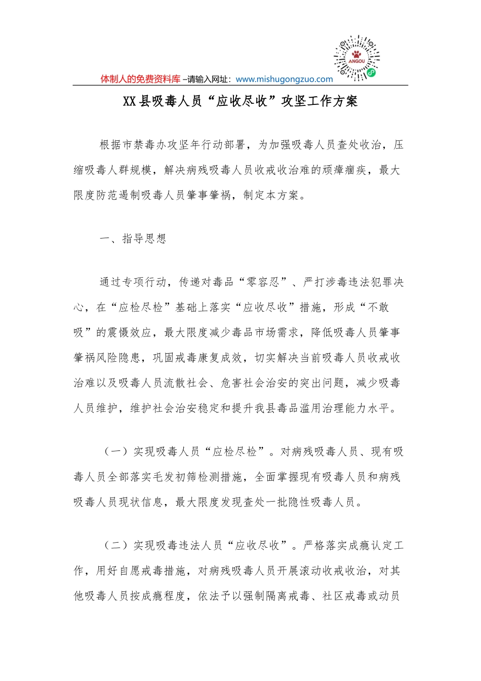 体制人的免费资料库 –请输入网址:www.mishugongzuo.com体制人的免费资料库 –请输入网址:www.mishugongzuo.comXX 县吸毒人员“应收尽收”攻坚工作方案根据市禁毒办攻坚年行动部署,为加强吸毒人员查处收治...