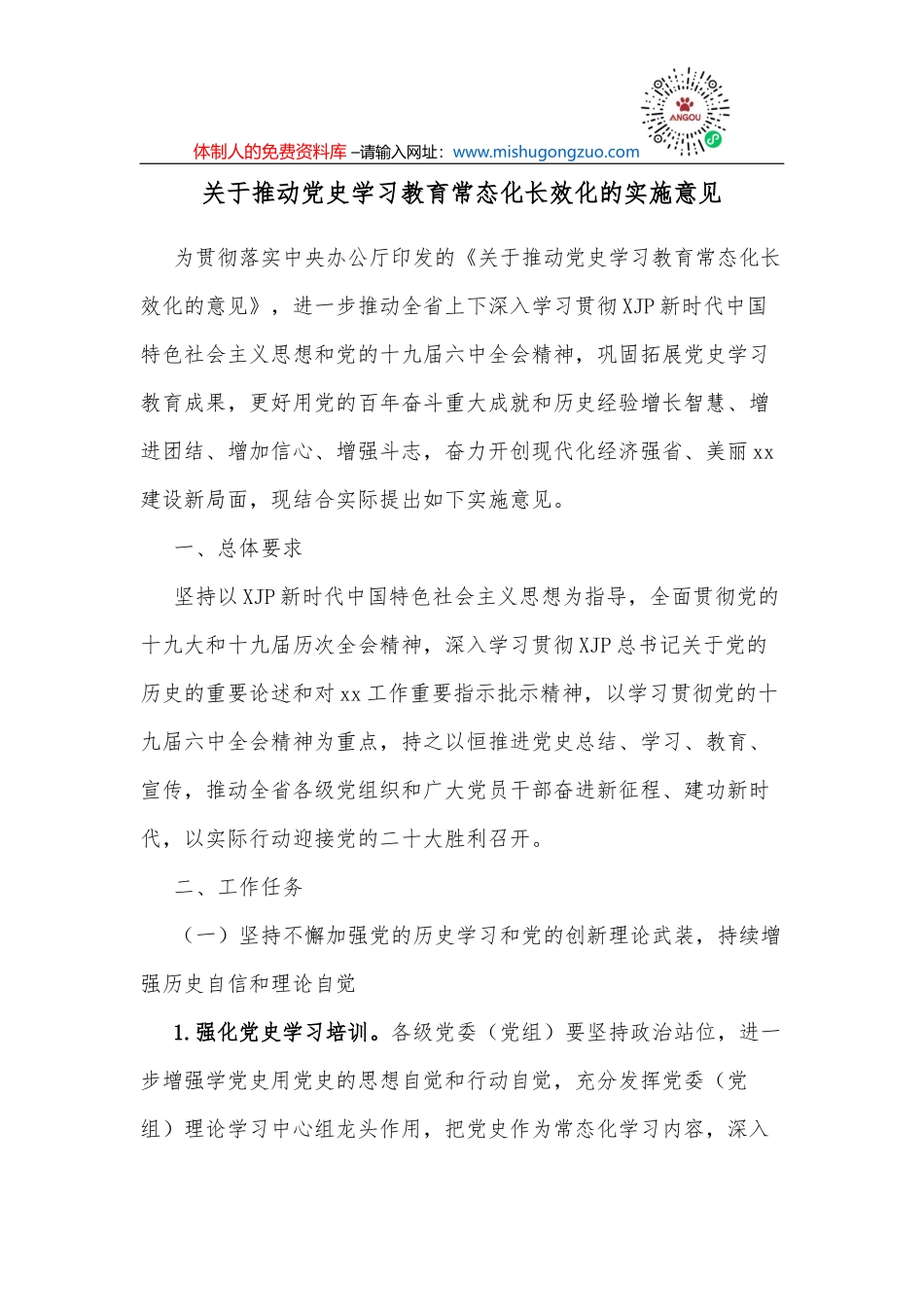 体制人的免费资料库 –请输入网址:www.mishugongzuo.com体制人的免费资料库 –请输入网址:www.mishugongzuo.com关于推动党史学习教育常态化长效化的实施意见为贯彻落实中央办公厅印发的《关于推动党史学习教...