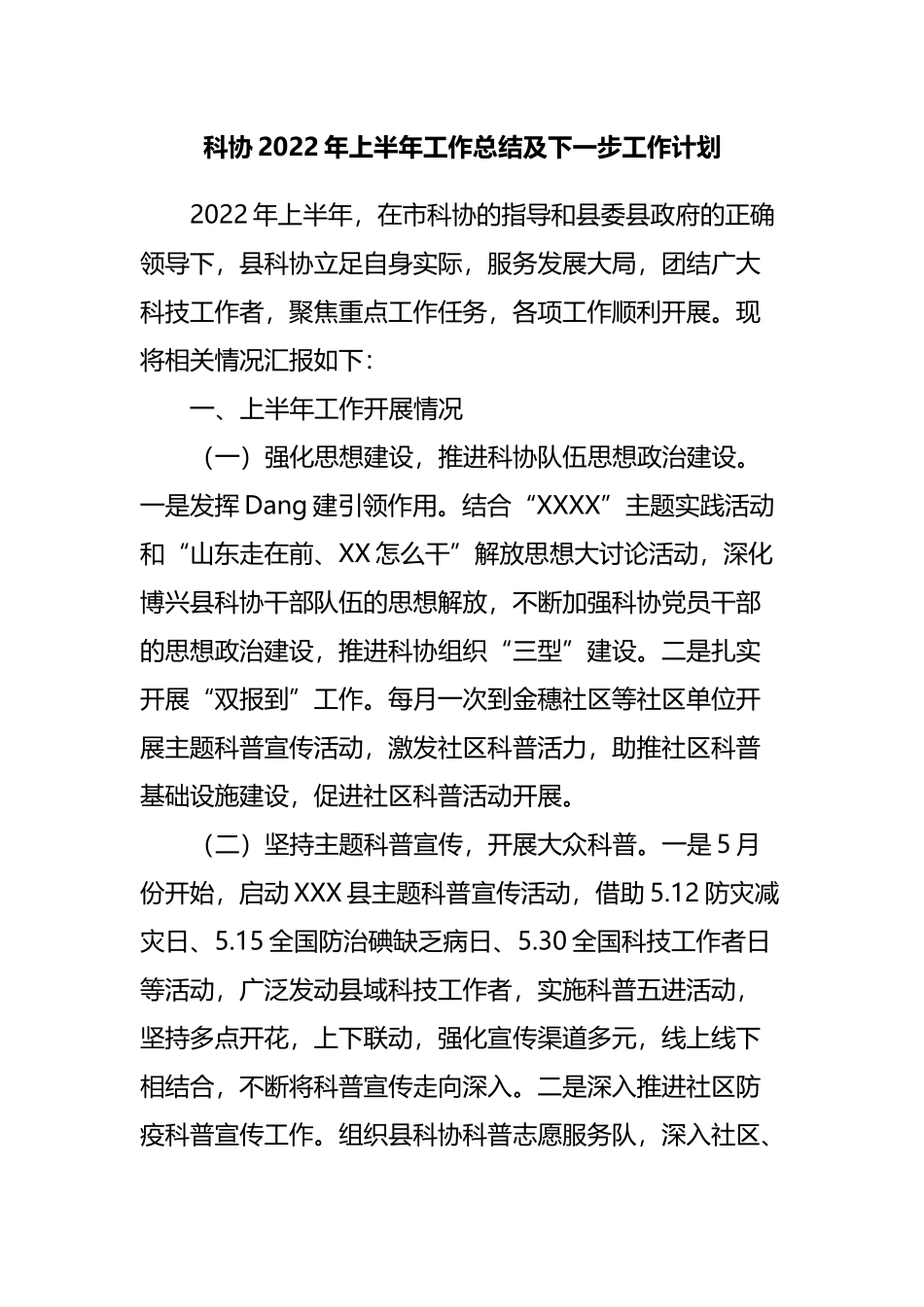 科协 2022 年上半年工作总结及下一步工作计划2022 年上半年,在市科协的指导和县委县政府的正确领导下,县科协立足自身实际,服务发展大局,团结广大科技工作者,聚焦重点工作任务,各项工作顺利开展。现将相...
