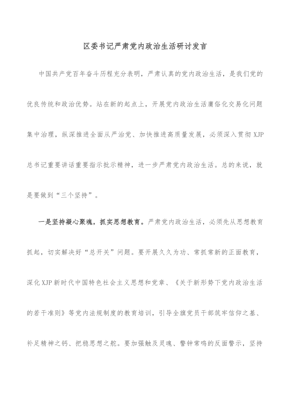 区委书记严肃党内政治生活研讨发言中国共产党百年奋斗历程充分表明,严肃认真的党内政治生活,是我们党的优良传统和政治优势。站在新的起点上,开展党内政治生活庸俗化交易化问题集中治理,纵深推进全面从严治党...