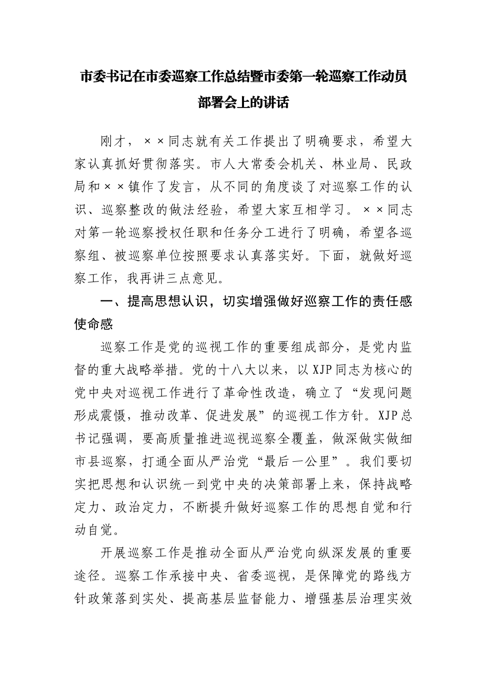 市委书记在市委巡察工作总结暨市委第一轮巡察工作动员部署会上的讲话刚才,××同志就有关工作提出了明确要求,希望大家认真抓好贯彻落实。市人大常委会机关、林业局、民政局和××镇作了发言,从不同的角度谈了...
