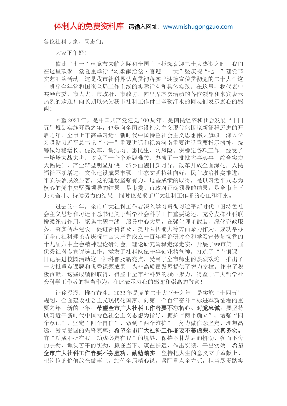 体制人的免费资料库 –请输入网址:www.mishugongzuo.com体制人的免费资料库 –请输入网址:www.mishugongzuo.com各位社科专家,同志们:大家下午好!值此“七一”建党节来临之际和全国上下掀起喜迎二十大热潮...