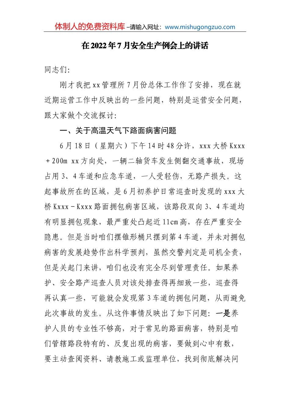 体制人的免费资料库 –请输入网址:www.mishugongzuo.com体制人的免费资料库 –请输入网址:www.mishugongzuo.com在 2022 年 7 月安全生产例会上的讲话同志们:刚才我把 xx 管理所 7 月份总体工作作了...