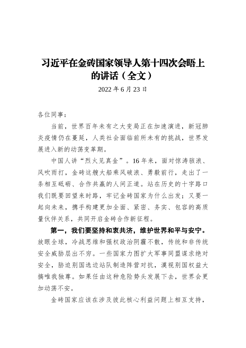 习近平在金砖国家领导人第十四次会晤上的讲话(全文)2022 年 6 月 23 日各位同事:当前,世界百年未有之大变局正在加速演进,新冠肺炎疫情仍在蔓延,人类社会面临前所未有的挑战,世界发展进入新的动荡变革...