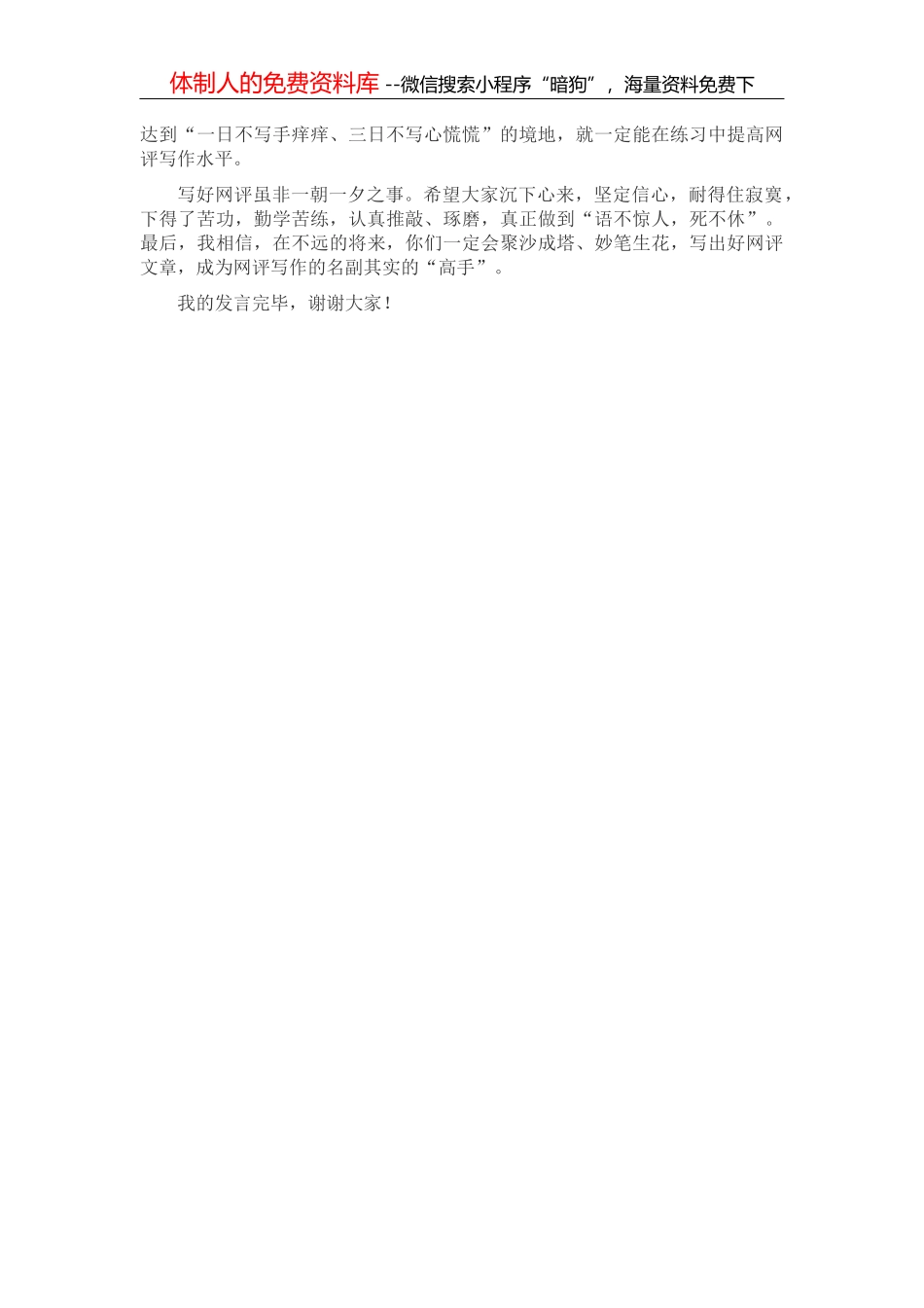体制人的免费资料库 --微信搜索小程序“暗狗”,海量资料免费下如何写好网评文章,可谓仁者见仁、智者见智。俗话说:“冰冻三尺非一日之寒。”写好网评文章决不是一朝一夕能够练成的,是一个漫长的修炼的过程,...