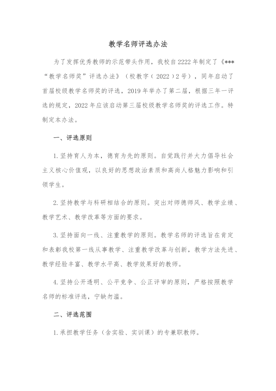 教学名师评选办法为了发挥优秀教师的示范带头作用,我校自 2222 年制定了《***“教学名师奖”评选办法》(校教字﹝2022﹞2 号),同年启动了首届校级教学名师奖的评选,2019 年举办了第二届,根据三年一评选...