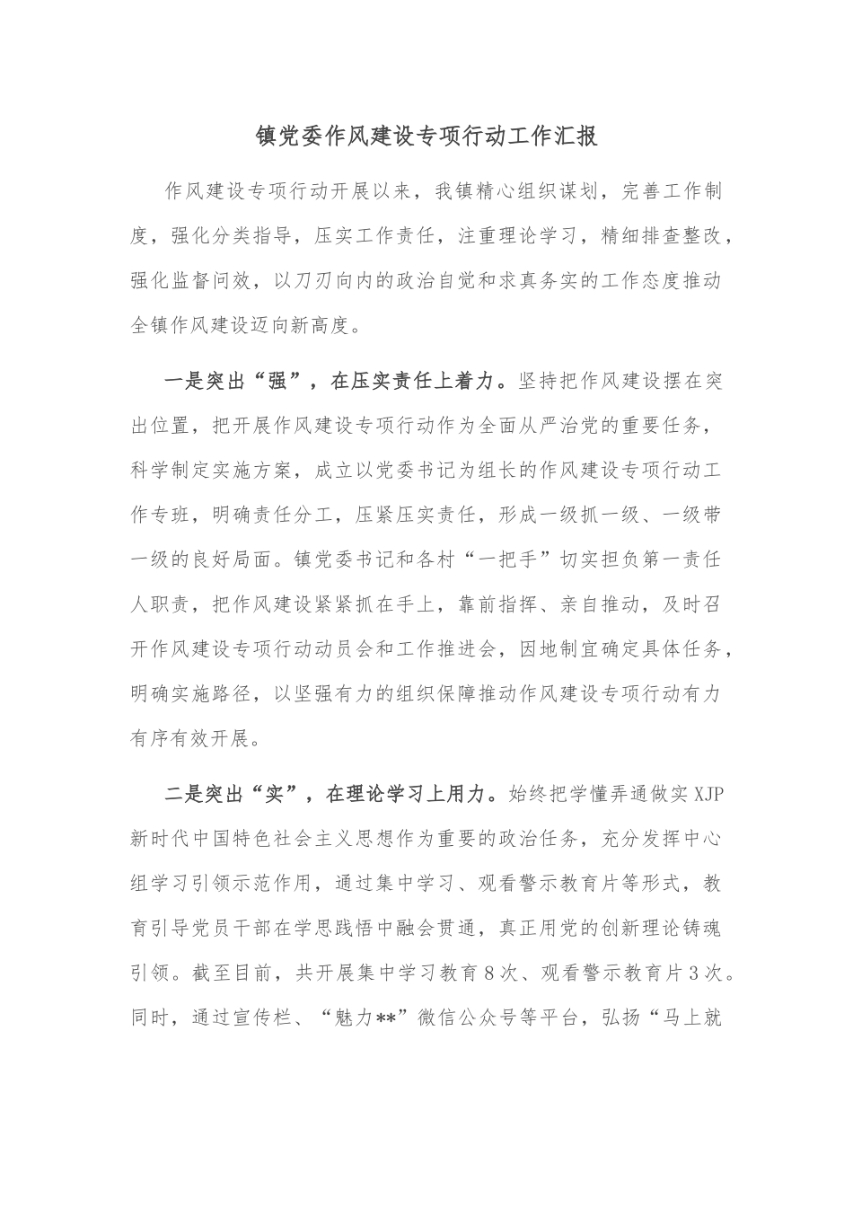 镇党委作风建设专项行动工作汇报作风建设专项行动开展以来,我镇精心组织谋划,完善工作制度,强化分类指导,压实工作责任,注重理论学习,精细排查整改,强化监督问效,以刀刃向内的政治自觉和求真务实的工作态...