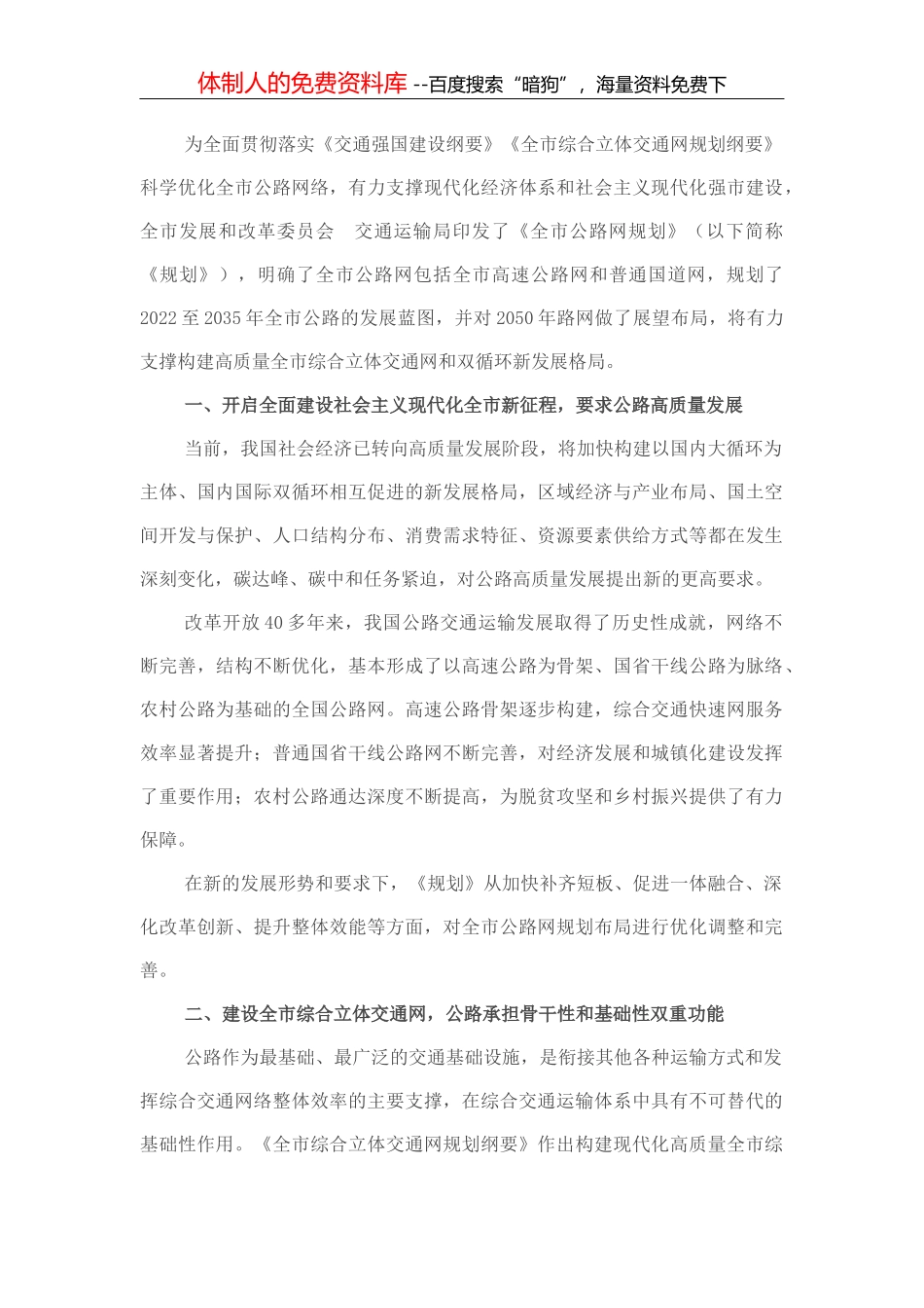 体制人的免费资料库 --百度搜索“暗狗”,海量资料免费下体制人的免费资料库 --百度搜索“暗狗”,海量资料免费下为全面贯彻落实《交通强国建设纲要》《全市综合立体交通网规划纲要》科学优化全市公路网络,有...