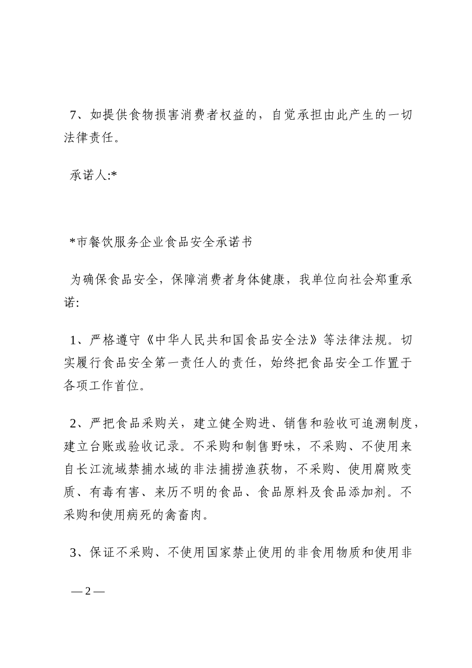 — 1 —餐饮服务企业食品安全承诺书 7 篇*市餐饮服务企业食品安全承诺书 为确保食品安全,保障消费者身体健康,我单位向社会郑重承诺: 1、严格遵守《中华人民共和国食品安全法》等法律法规。切实履行食品安...