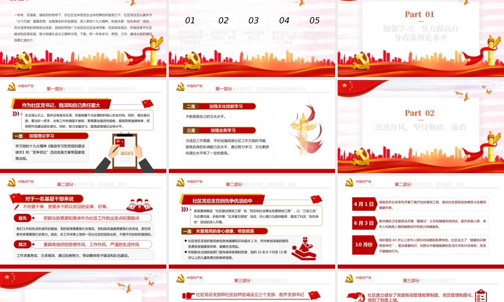 年终党建工作述职报告基层党组织党委党支部书记年终工作总结计划暨述职报告通用模板汇报人:某某某社区(村)党支部书记时间: XXX一年来,在镇委、镇政府的领导下,在社区全体党员及全体同事的积极努力下,社区...