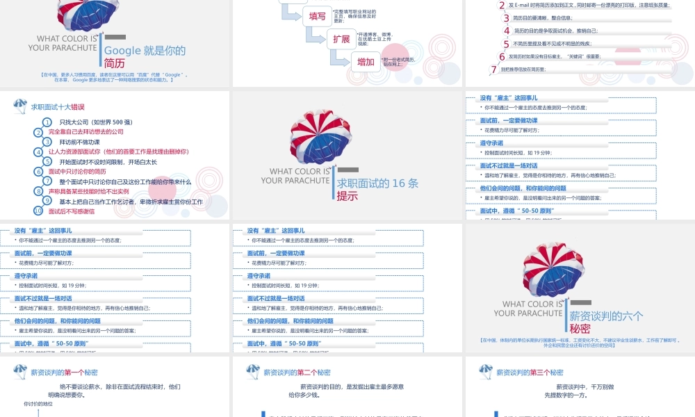 你的降落伞是什么颜色 ?WHAT COLOR IS YOUR PARACHUTURE?[ 美 ] 理查德 · 尼尔森 · 鲍利斯 著 李春雨 王鹏程 陈雁 译如果有人问我求职读什么书,我的回答是:读那些活了很多很多年的求职书,...
