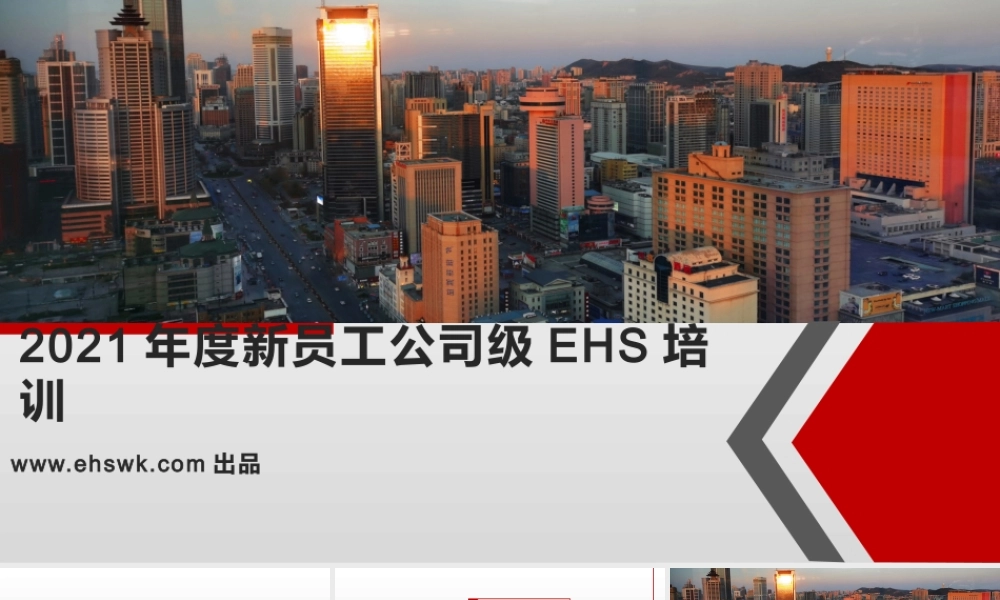 www.ehswk.com 出品2021 年度新员工公司级 EHS 培训 声明: www.ehswk.com 原创出品,仅供个人使用,严禁扩散,侵权必投诉目录01培训序言安全环保意识安全环保知识安全环保技能安全环保法律法规公司规章制...