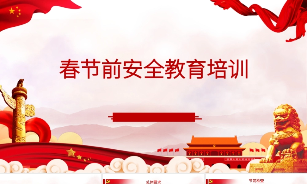 春节前安全教育培训节前总体安排0 102节前安全意识提升03节前安全知识学习04节假日安全及防疫建议目录总体要求提前做好值班安排,节假日值班必须配备值班领导,值班人员以及相关管理人员在放假期间电话保持 24...