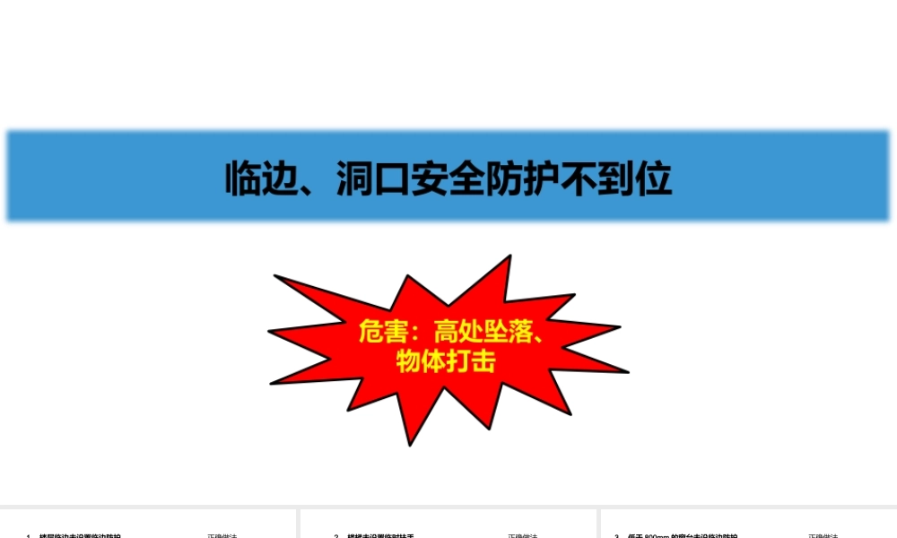 临边、洞口安全防护不到位危害:高处坠落、物体打击1 、楼层临边未设置临边防护正确做法×√ 《建筑施工高处作业安全技术规范》( JGJ80-2016 ) 4.1.1 规定: 坠落高度基准面 2m 及以上进行临边作业时...