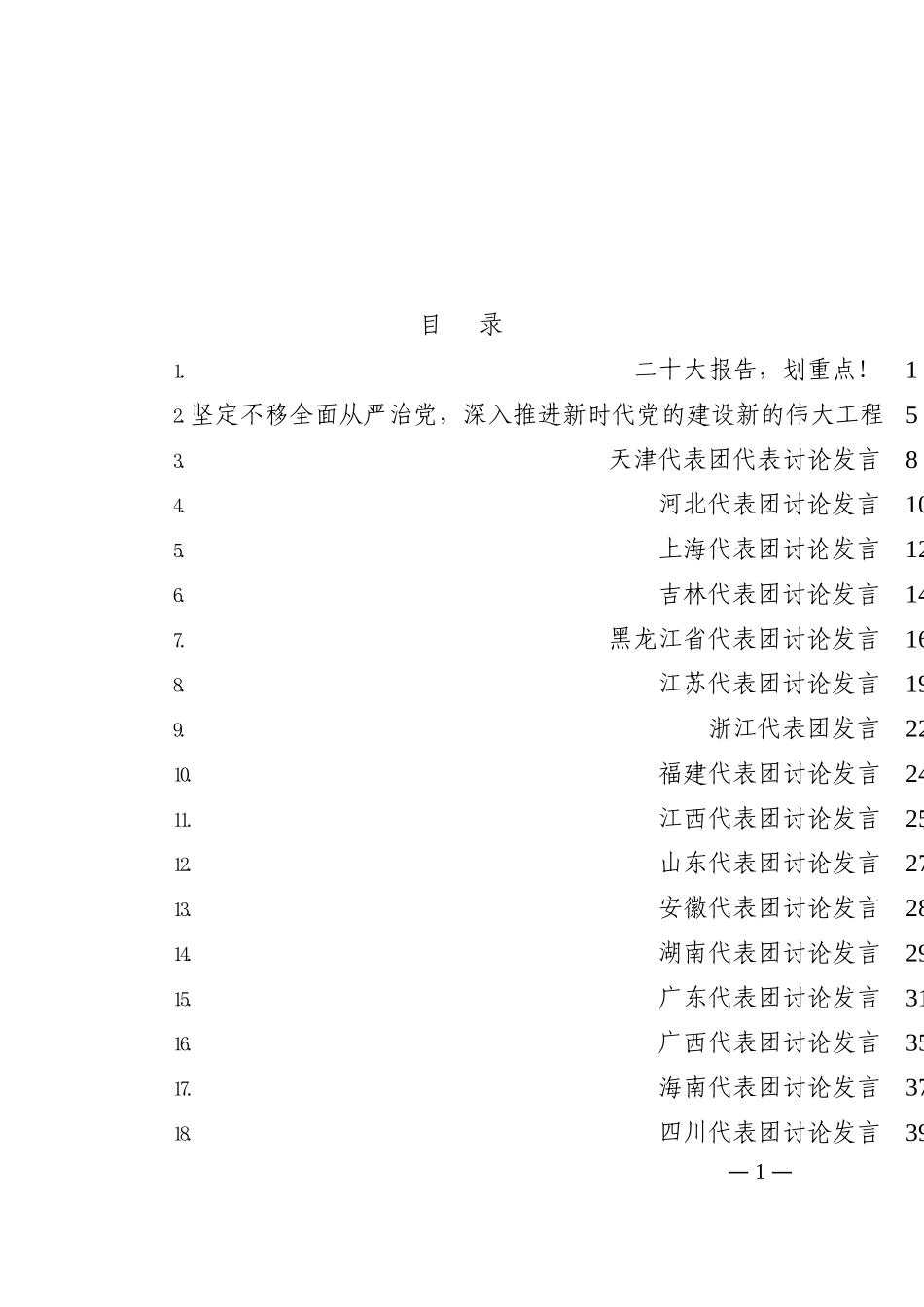目录1.二十大报告,划重点!12.坚定不移全面从严治党,深入推进新时代党的建设新的伟大工程53.天津代表团代表讨论发言84.河北代表团讨论发言105.上海代表团讨论发言126.吉林代表团讨论发言147.黑龙江省代表团讨论...