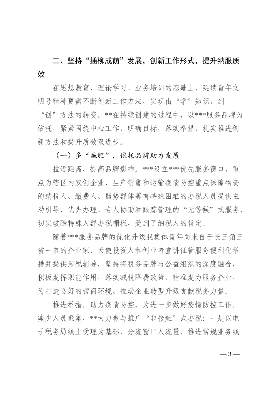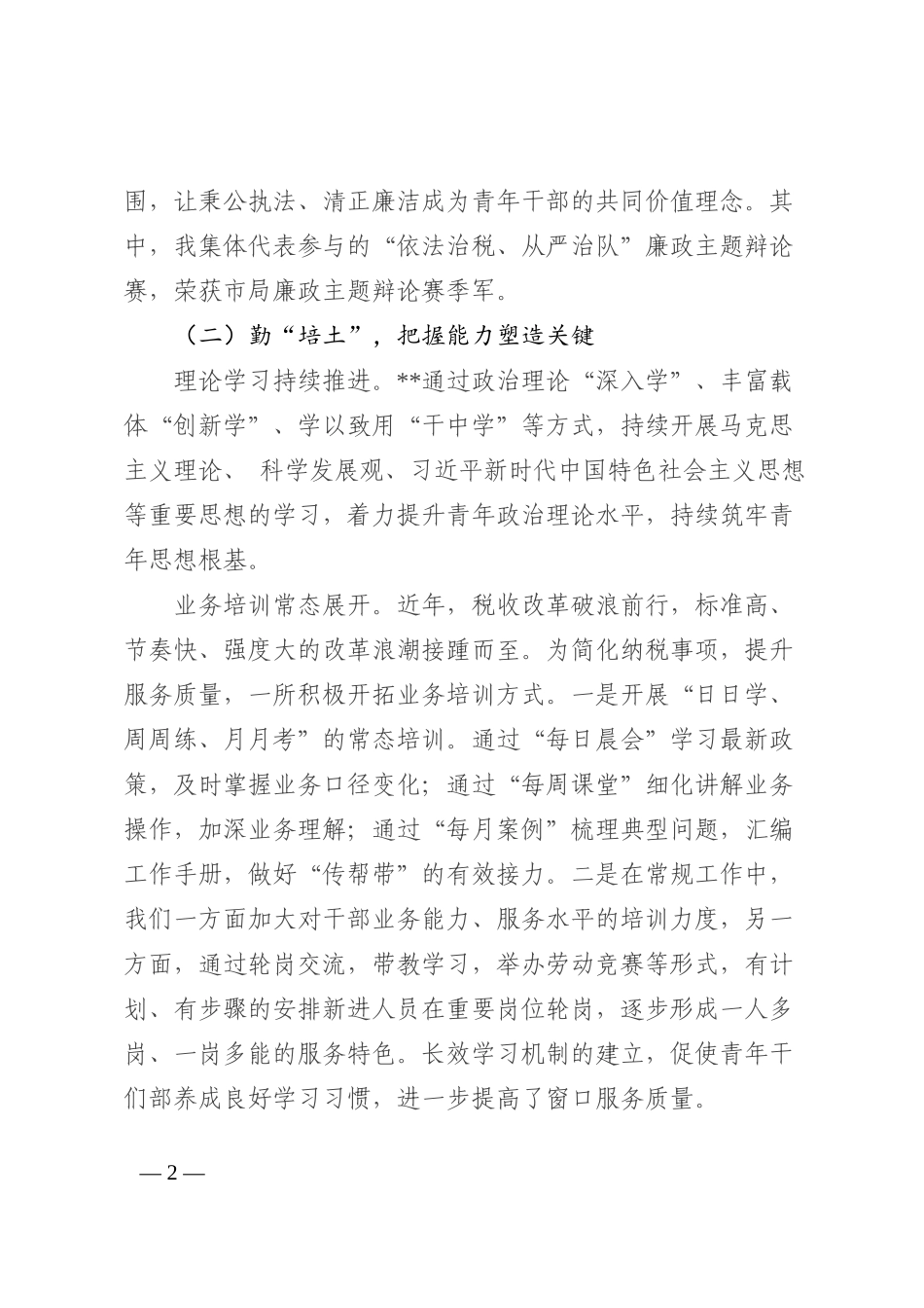 — 1 —区税务局工作情况汇报***是对外服务的窗口,主要承担申报纳税、综合服务、发票管理等工作。作为一支青年队伍,充满朝气、蓬勃向上、开拓创新是我们长久以来贯彻的精神面貌,集体曾获“*********”、连续...