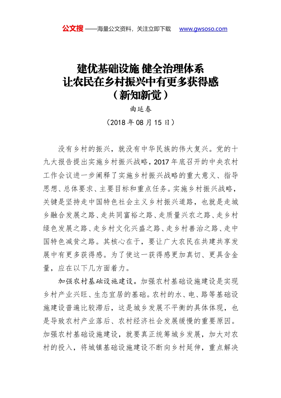 公文搜 ——海量公文资料,关注立即下载 www.gwsoso.com 建优基础设施 健全治理体系让农民在乡村振兴中有更多获得感(新知新觉)曲延春(2018 年 08 月 15 日) 没有乡村的振兴,就没有中华民族的伟大...