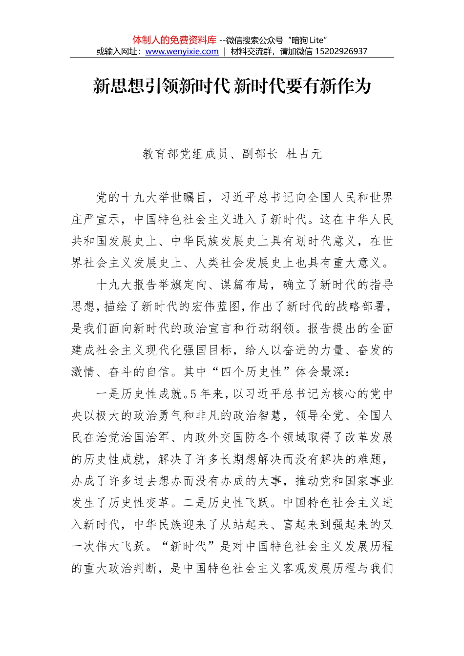 体制人的免费资料库 --微信搜索公众号“暗狗 Lite”或输入网址:www. wenyixie .com | 材料交流群,请加微信 15202926937新思想引领新时代 新时代要有新作为教育部党组成员、副部长 杜占元 党的十九大...