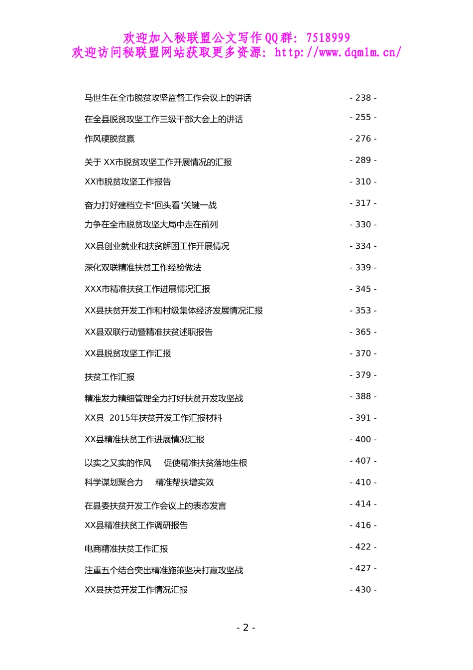 欢迎加入秘联盟公文写作 QQ 群:7518999欢迎访问秘联盟网站获取更多资源:http://www.dqmlm.cn/ 目 录在深度贫困地区脱贫攻坚座谈会上的讲话- 5 -- 19 -国务院关于脱贫攻坚工作情况的报告怀宁县脱贫攻坚...