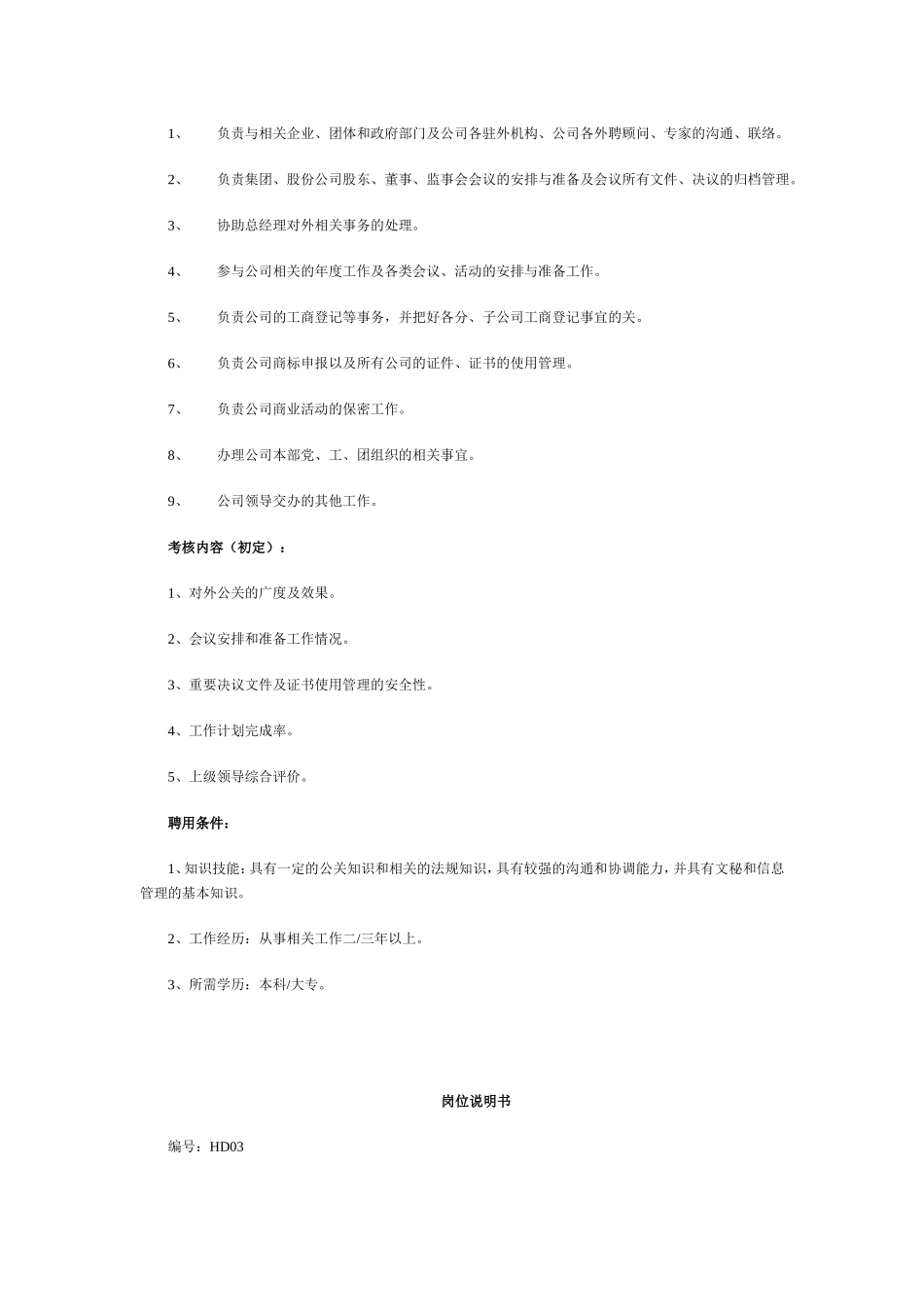 岗位说明书 编 号:HD01 岗位名称:行政主管 所在部门:本部 工作关系: 1、上级:总经理/副总经理(分管) 2、下级:本部后勤服务人员和相关行政管理人员 3、内部联系:公司各部门、各分、子公司 4、外...