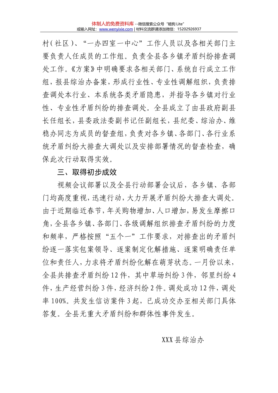 体制人的免费资料库 --微信搜索公众号“暗狗 Lite”或输入网址:www.wenyixie.com | 材料交流群请添加微信:15202926937XXX 县矛盾纠纷大排查大调处行动动员部署情况汇报市综治办:根据省市综治委、维稳领导...
