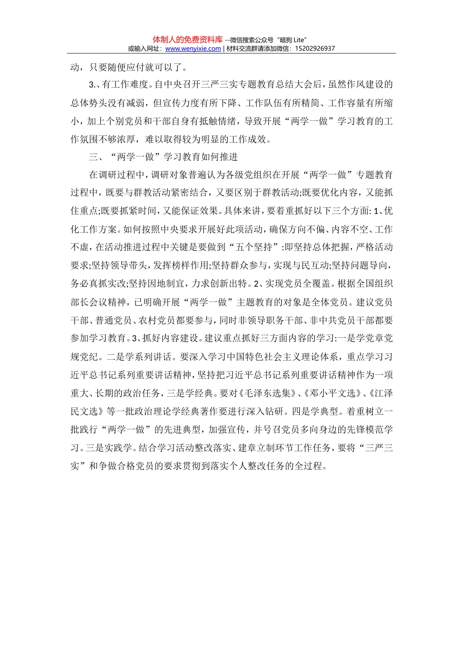 体制人的免费资料库 --微信搜索公众号“暗狗 Lite”或输入网址:www.wenyixie.com | 材料交流群请添加微信:15202926937“两学一做”主题教育活动调研报告在全体党员中深入开展“两学一做”学习教育,是落实...