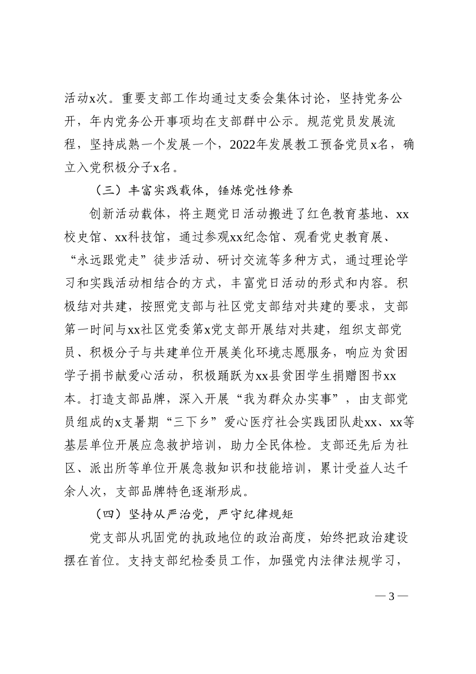 学校党支部书记2022年党建述职报告范文(1)根据学校党委工作安排,现将本人2022年履行党支部书记职责情况报告如下:一、问题整改情况上年度存在三个方面的问题:党建带动业务水平有待提升;党员教育有待加强;党...