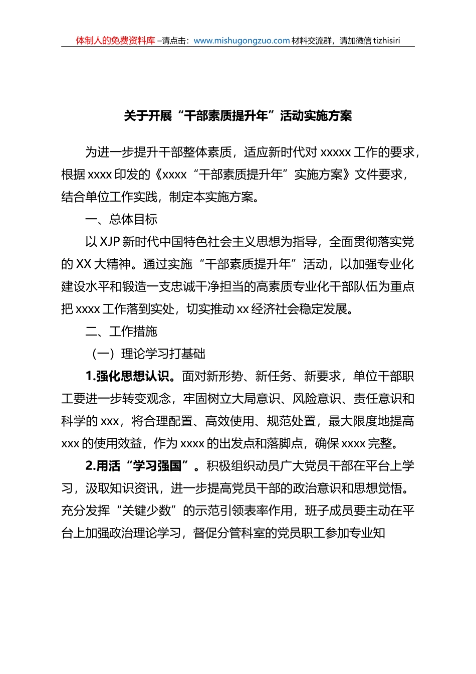 体制人的免费资料库 –请点击:www.mishugongzuo.com 材料交流群,请加微信 tizhisiri关于开展“干部素质提升年”活动实施方案为进一步提升干部整体素质,适应新时代对 xxxxx 工作的要求,根据 xxxx 印发...
