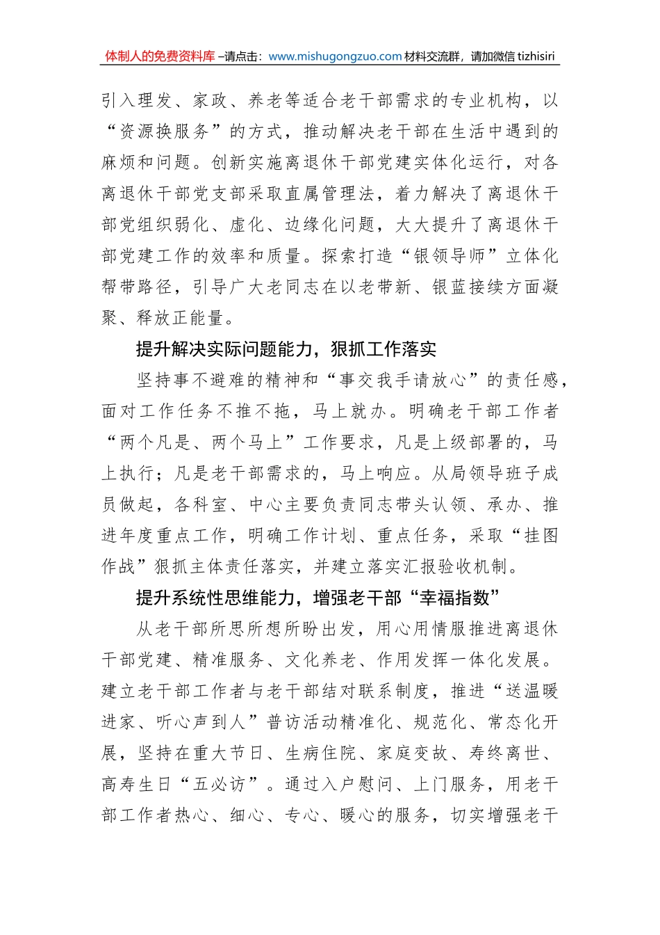 体制人的免费资料库 –请点击:www.mishugongzuo.com 材料交流群,请加微信 tizhisiri干部队伍能力建设提升工作政务信息、工作简报、经验交流汇编(8 篇)目录1.提升“四种能力” 打造过硬老干部工作队伍......