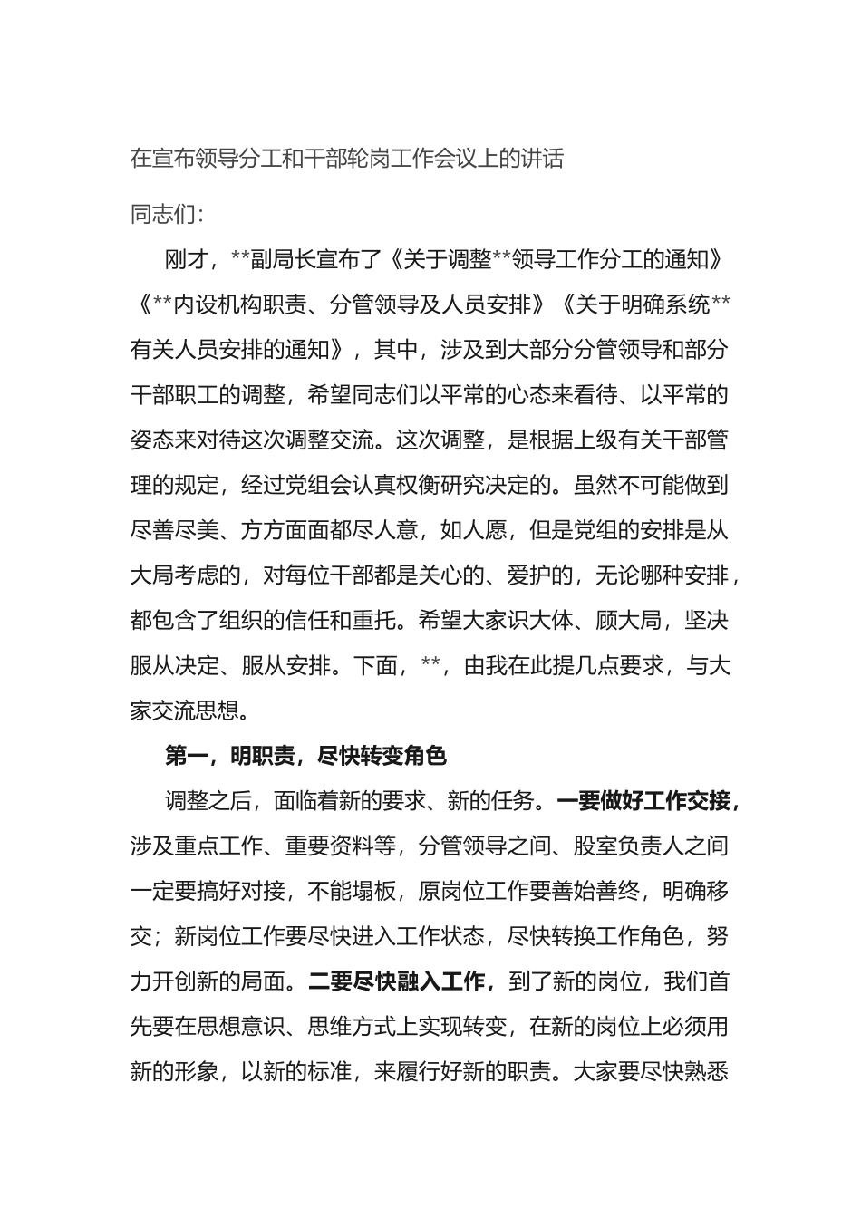 在宣布领导分工和干部轮岗工作会议上的讲话同志们:刚才,**副局长宣布了《关于调整**领导工作分工的通知》《**内设机构职责、分管领导及人员安排》《关于明确系统**有关人员安排的通知》,其中,涉及到大部分分...