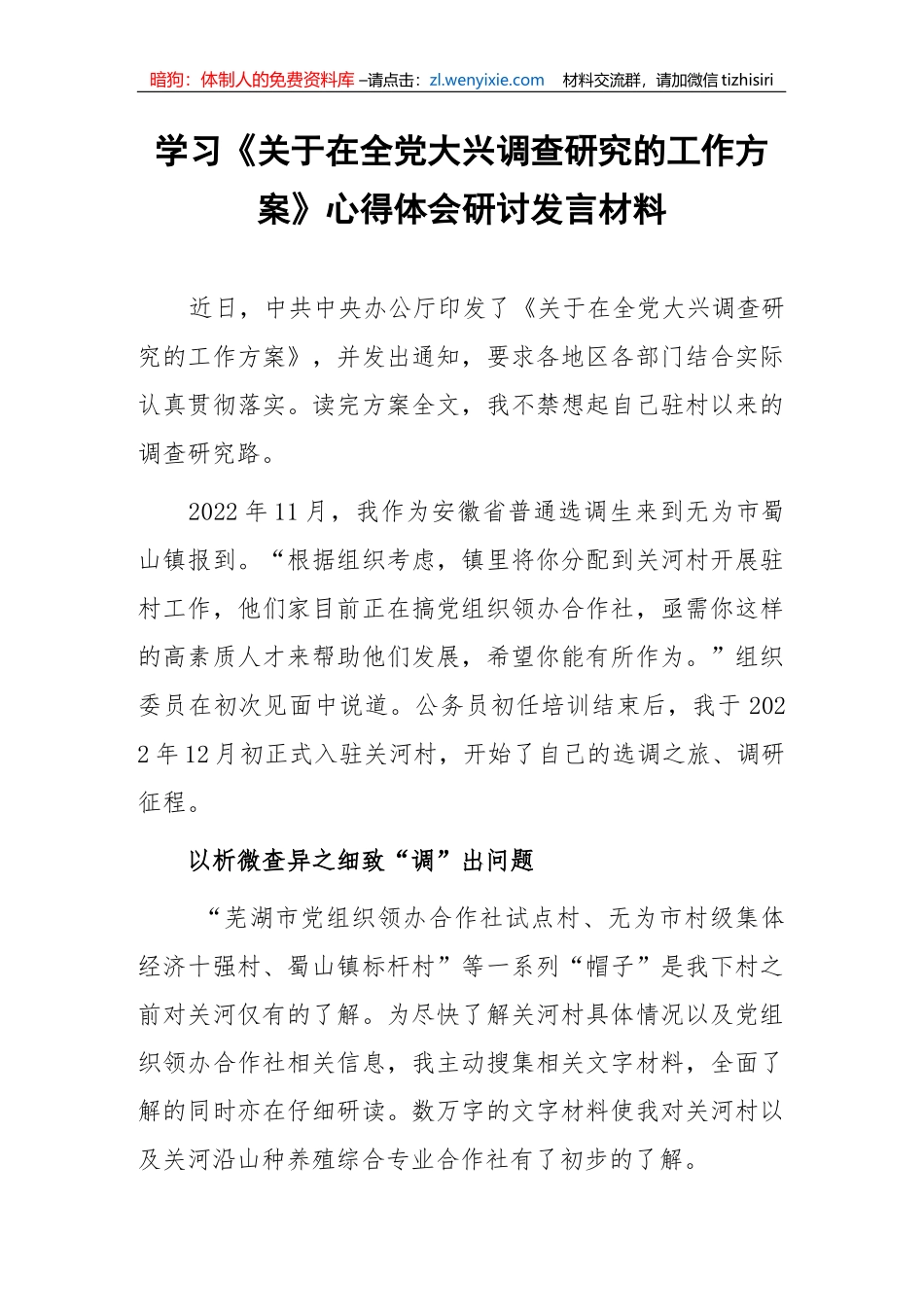 【大兴调查研究】基层纪检干部2023学习《关于在全党大兴调查研究的工作方案》心得研讨发言材料-5篇_第1页