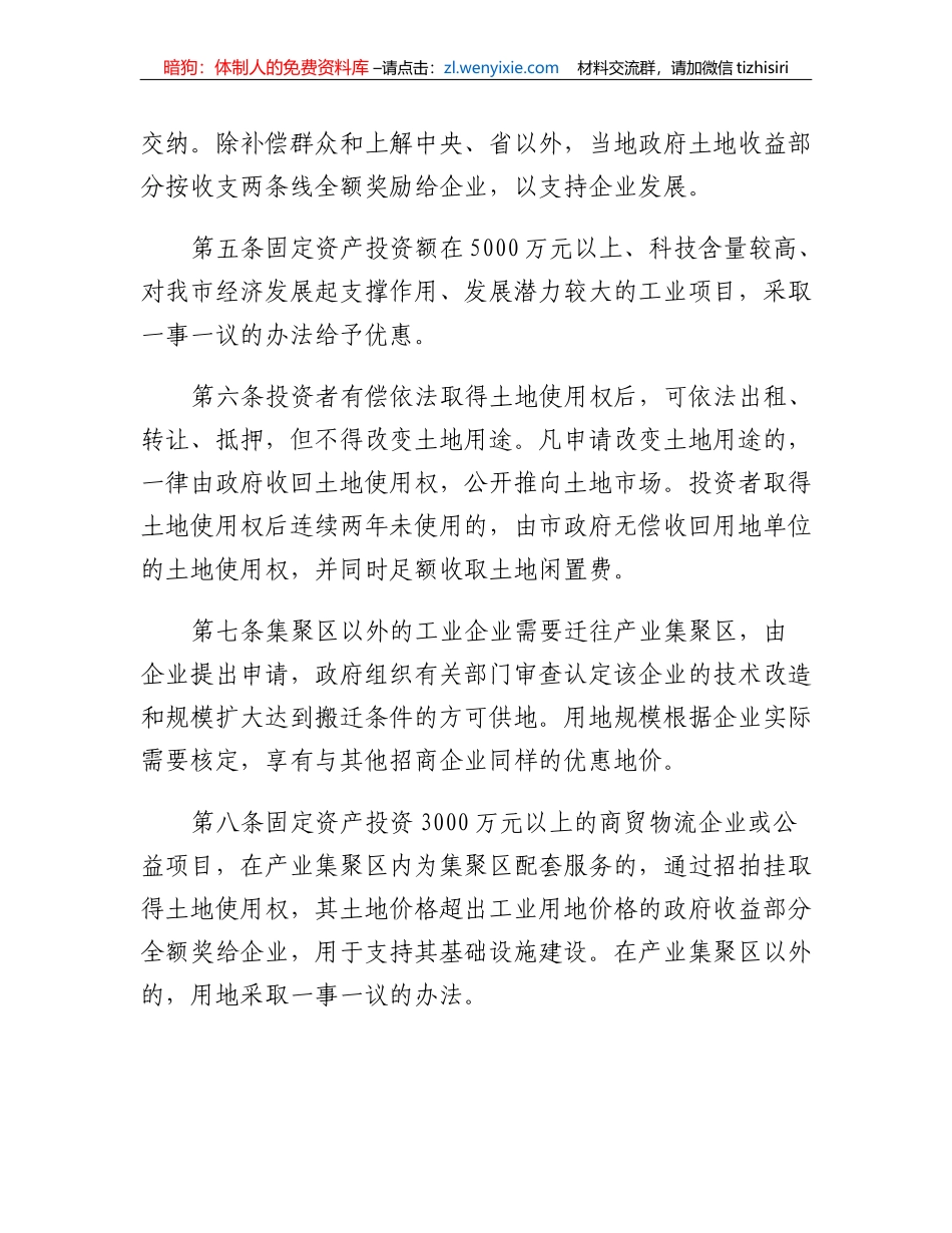 暗狗:体制人的免费资料库 –请点击:zl.wenyixie.com 材料交流群,请加微信 tizhisiri关于招商引资优惠政策的若干规定为进一步加大招商引资力度,积极承接产业转移,加速我市经济赶超跨越式发展,按照国家法...